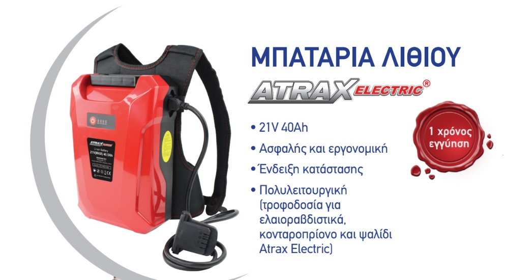 • Πολυλειτουργική (τροφοδοσία για ελαιοραβδιστικά, κονταροπρίονο και ψαλίδι Atrax Electric)