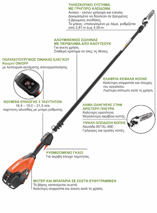 Εξοπλισμένο με αλυσίδα υψηλής απόδοσης 80TXL (.325-1.1mm/46E), προσφέρει ομαλές και γρήγορες κοπές, που ευνοούν καλύτερη επούλωση των κλαδιών. Χάρη στον τηλεσκοπικό σχεδιασμό του, ρυθμιζόμενο από 2800mm έως 3970mm, επιτρέπει εύκολη πρόσβαση σε ψηλά κλαδιά με ελάχιστη προσπάθεια.